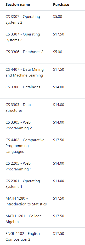 また、Databases 2とOperating Systems 2は同じ科目で追加で5ドル課金されてますが、これはぎりぎりになって試験勉強が間に合わないと感じて試験をリスケジュールしたせいです(直前のスケジュール変更は追加料金を取られる)。金曜日にFinal Exam受けるとか無謀だった。